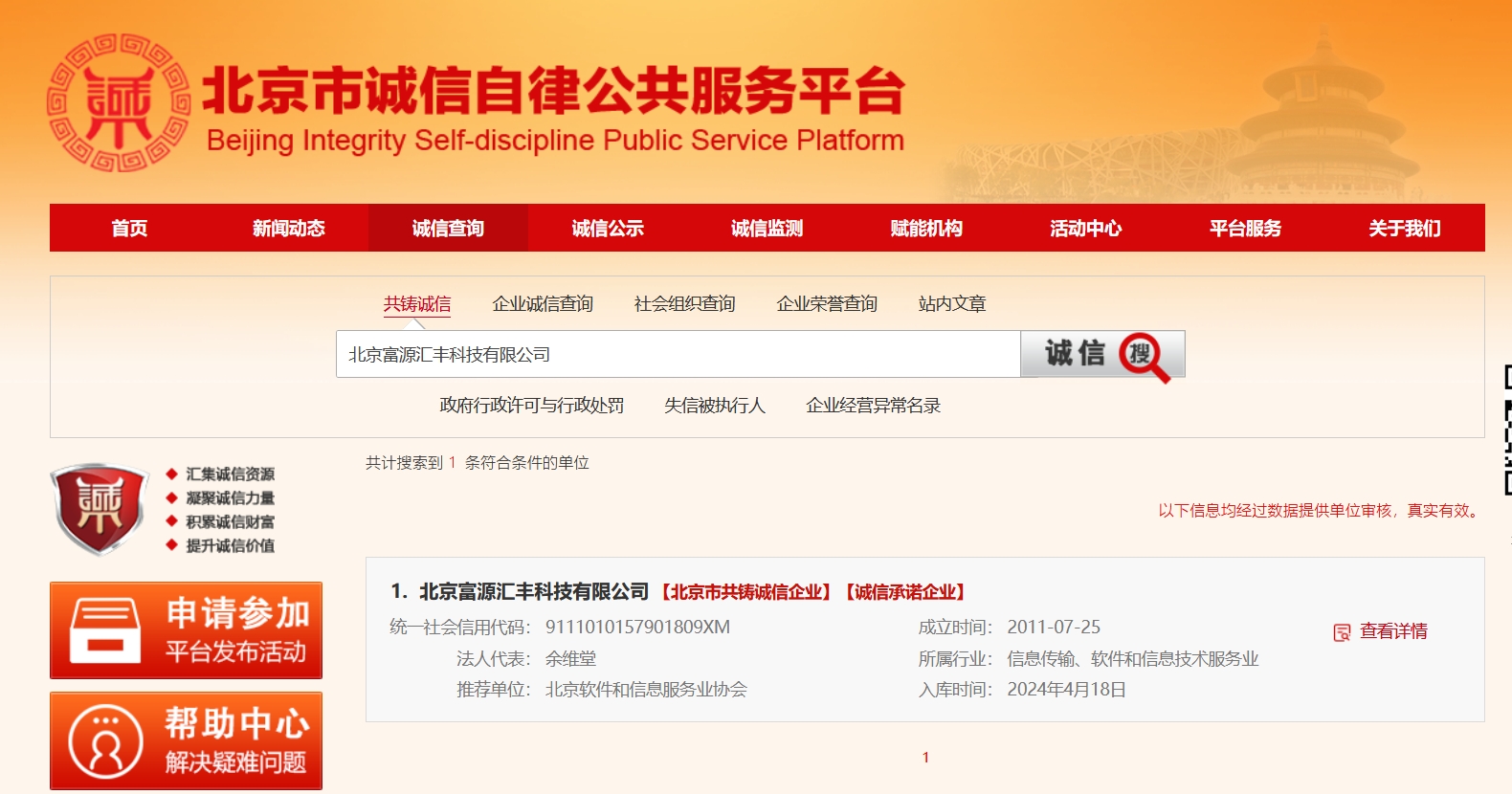 北京富源匯豐科技有限公司作為北京軟件和信息服務(wù)業(yè)協(xié)會(huì)成員單位,成功入選2023年度“北京市共鑄誠(chéng)信企業(yè)名錄庫(kù)”。(查詢(xún)網(wǎng)址:www.bisp...